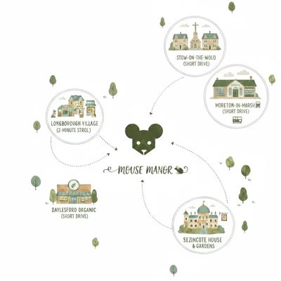 Mouse Manor serves as your perfect base for exploring the best Cotswold attractions in the region. You are within a "stone's throw" of: Longborough Village, home to the renowned Longborough Opera, a community-led village store, and the welcoming Coach and Horses pub (just a 2-minute stroll). Daylesford Organic is a short drive away for the ultimate Cotswold shopping experience. Sezincote House & Gardens allows you to discover the exotic architecture of this nearby estate. Stow-on-the-Wold & Moreton-in-Marsh invite you to experience the boutiques, antique shops, and markets of these iconic market towns, both less than 10 minutes away.